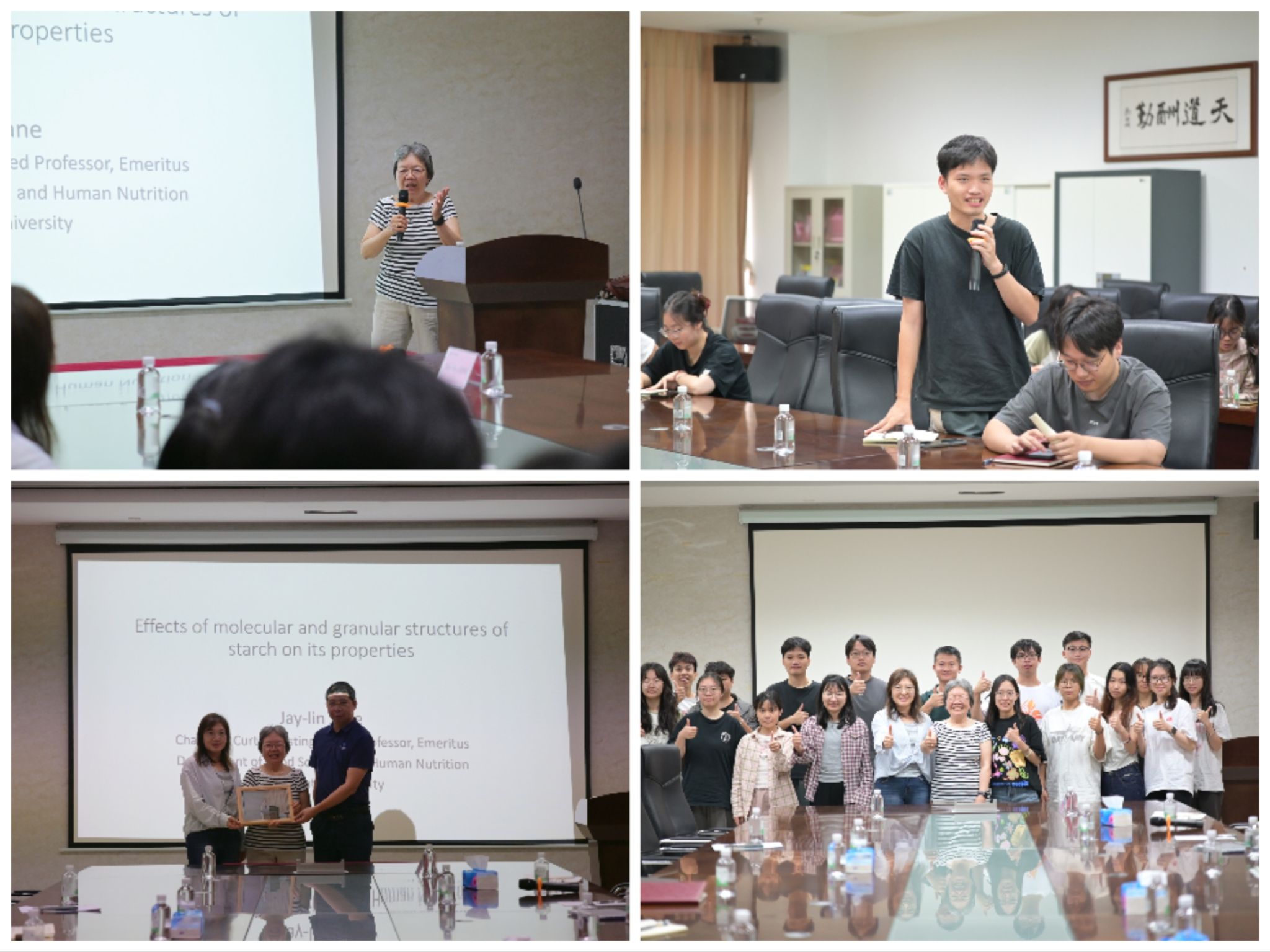 报告会上,Jane教授以《淀粉分子和颗粒结构对性质的影响》为题,系统介绍了淀粉科学的基础和前沿研究进展。报告不仅涵盖了淀粉精细结构、性质表征等基础理论知识,更融入了Jane教授在淀粉改性与应用领域的宝贵经验,为在场师生呈现了一场理论与应用并重的学术盛宴。在互动环节,师生们围绕淀粉的酶解机制优化、交联改性技术创新以及清洁标签淀粉生产工艺等热点问题,与Jane教授展开了深入交流,现场学术氛围浓厚,讨论热烈。报告会后,谢炯标代表公司向Jane教授赠送了纪念品,全体参会人员合影留念。