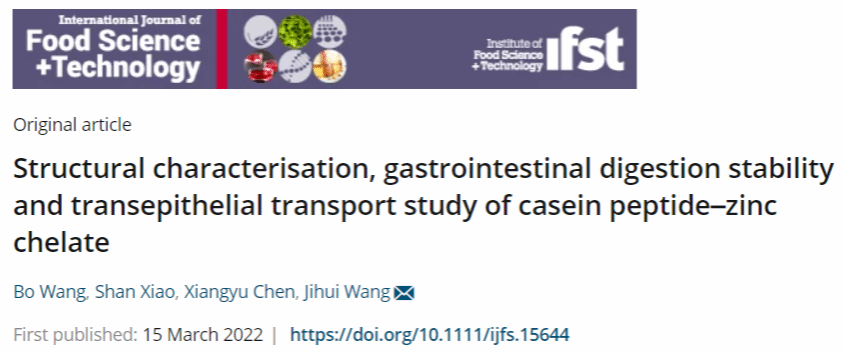 2022年3月,beats365vip官网登录入口化学工程与能源技术公司王波博士(第一作者)在国际食品期刊《International Journal of Food Science and Technology》(IF:3.612, 中科院二区)发表了题为“Structural characterisation, gastrointestinal digestion stability and transepithe-lial transport study of casein peptide–zinc chelate”的研究论文。