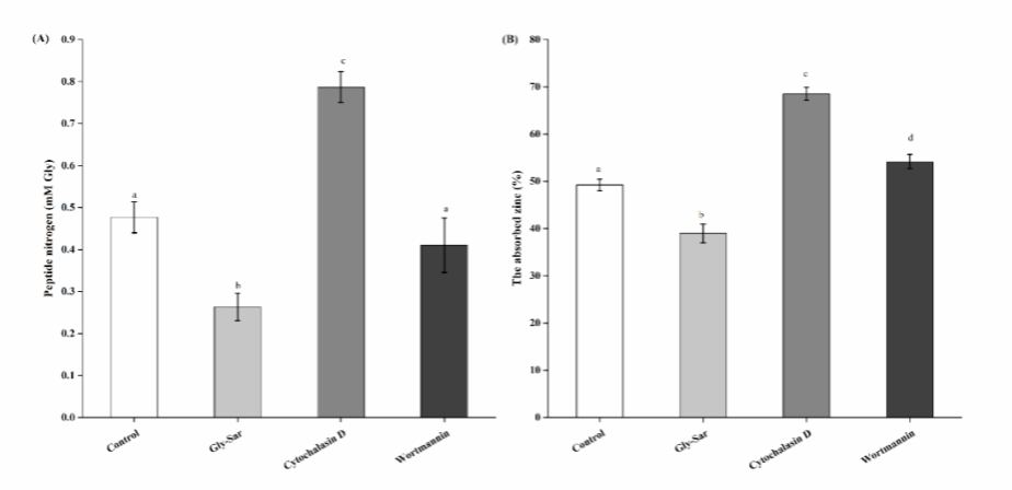 肽-锌螯合物作为第四代锌补充剂,在保健品和食品营养学领域受到广泛的关注。在这项工作中,重点研究了牛奶源酪蛋白肽-锌螯合物的结构特点和消化吸收特性。酪蛋白肽中羰基和羧基氧原子、酰胺基团参与了锌离子的螯合,且螯合锌离子后酪蛋白肽的表面负电荷性减弱,导致螯合物聚集成较大颗粒。经体外模拟胃肠消化吸收,仍然有40%的锌离子以肽-锌螯合物的形式存在,这部分螯合物可以通过PepT1路径和细胞旁路跨膜吸收进入血液循环。这项工作为新型锌离子吸收载体的开发和应用提供了理论参考。