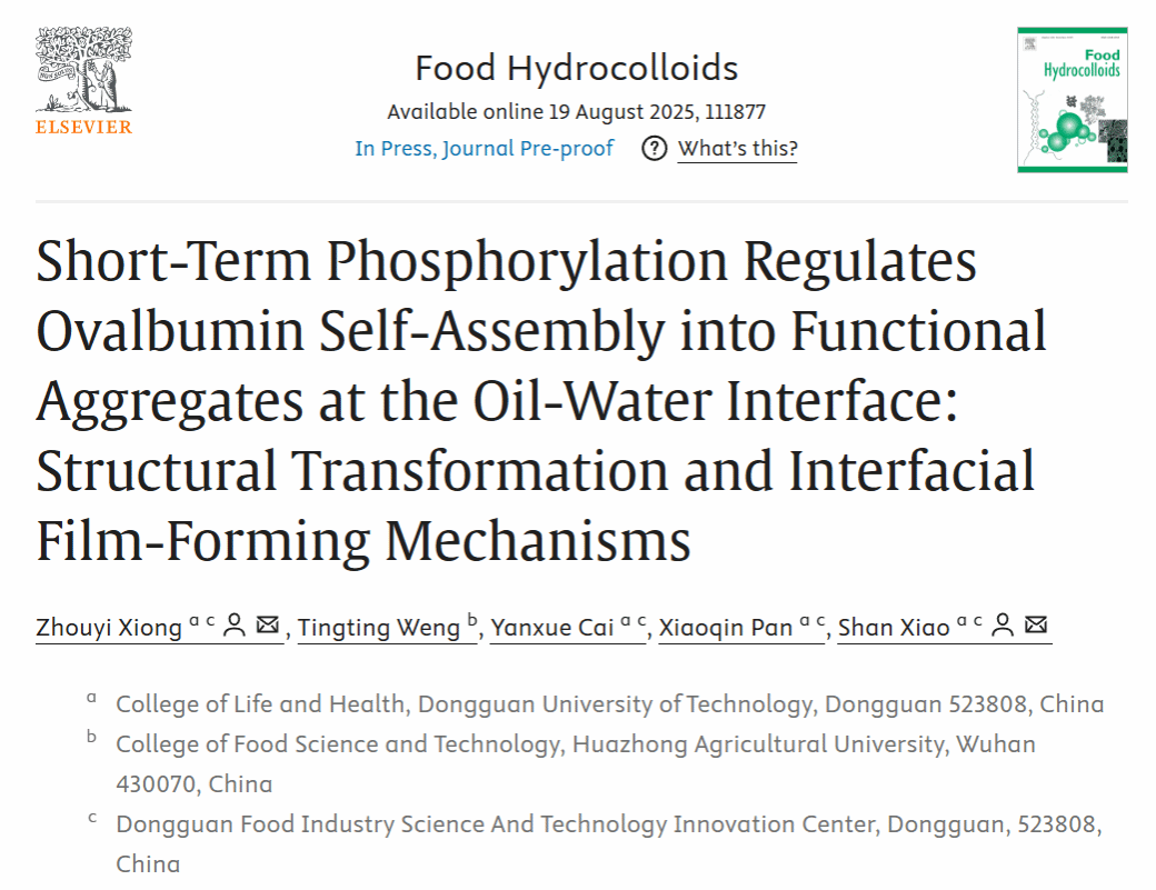 2025年8月,公司肖珊教授团队于国际食品顶级期刊《Food Hydrocolloids》(IF = 12.4)在线发表题为“Short-Term Phosphorylation Regulates Ovalbumin Self-Assembly into Functional Aggregates at the Oil-Water Interface: Structural Transformation and Interfacial Film-Forming Mechanisms”的研究性文章。论文第一作者为熊舟翼特聘副研究员,共同通讯作者为肖珊教授。