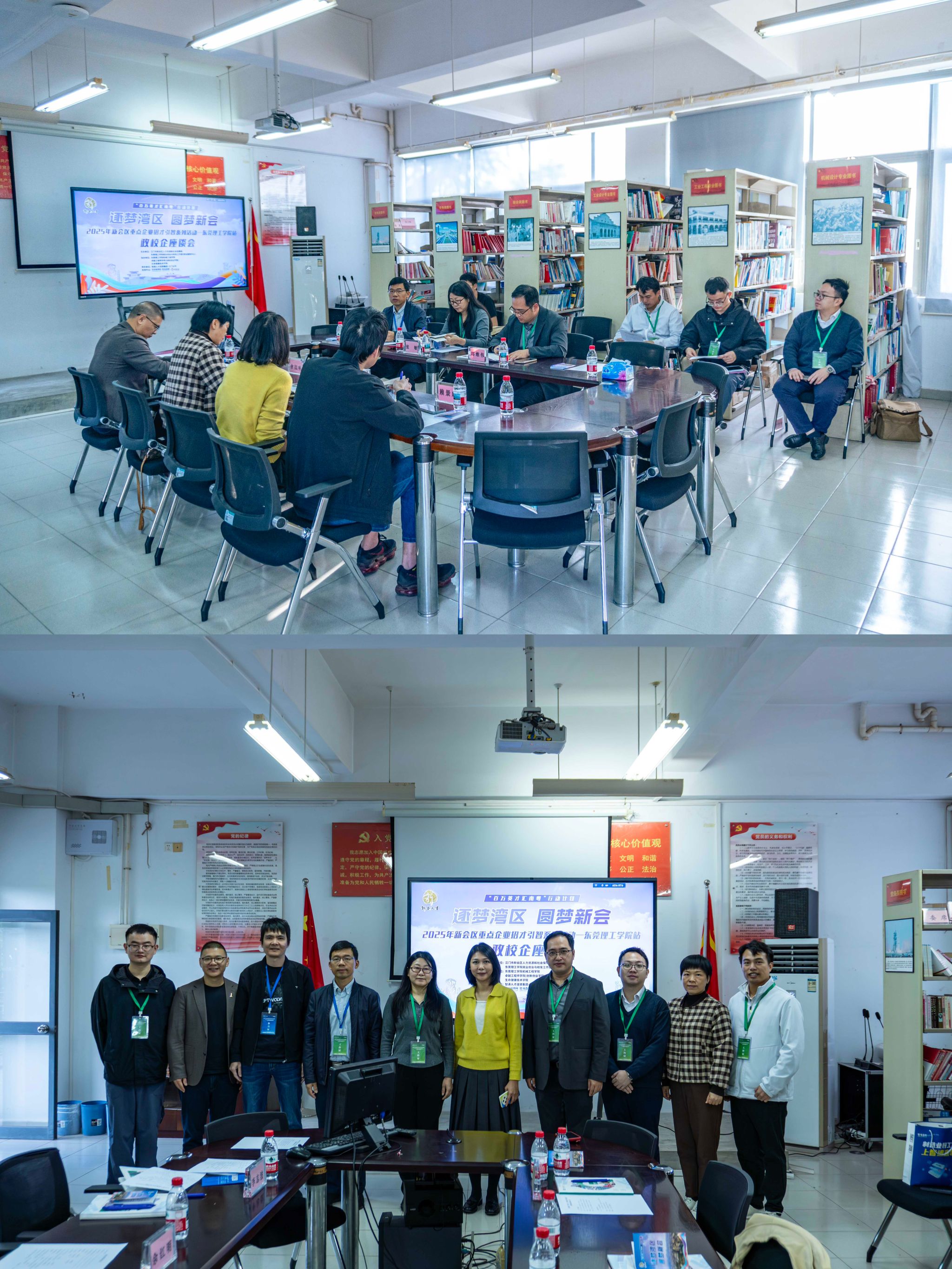 与此同时,招聘会期间还举办了政校企交流座谈会。3个公司的相关领导与江门市新会区人力资源和社会保障局相关负责人、新会企业代表齐聚一堂,围绕人才培养、岗位供给、校企合作模式创新等议题展开深入交流,为后续建立长效合作机制、拓宽用工求职双选渠道、实现资源共享奠定坚实基础。